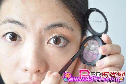 6MAC金色眼影,要让颜色更饱和,可以弄湿刷子,效果会有很大不同哦~用金色打底 然后用MAC紫色和灰黑色眼影来做烟熏效果。和金色一起晕染开来。 来看看