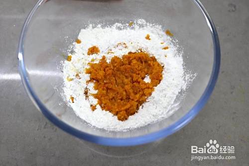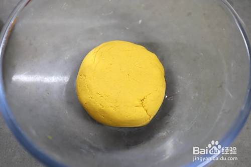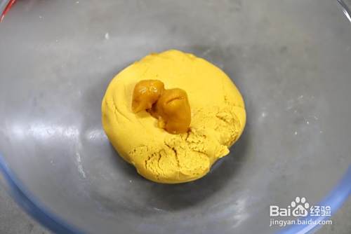 将南瓜泥与糯米粉揉成面团,由于糯米粉比较吃水,南瓜泥可根据面团的软硬程度来适量增加。