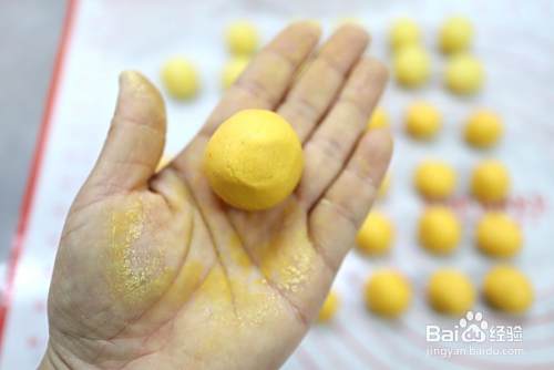 将椰蓉馅分成10克一个搓圆,共12个;接着将南瓜面团称重后分成24等份,分别揉成球,准备一张大的保鲜膜,揉好后的面团都要用保鲜膜盖严,防止水份蒸发。