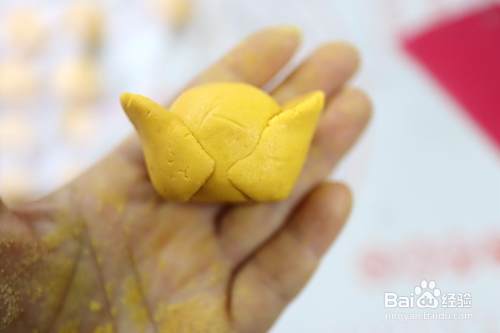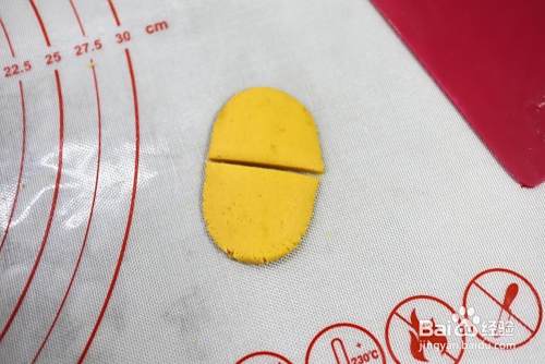 剩下的12个糯米南瓜球做元宝的两翼:取一个小球搓成椭圆形,按扁,用刮刀拦腰分成两半。
