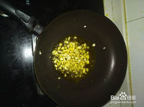 炸茄子的锅中还有剩余的油,将蒜末放入锅中,炸出香味