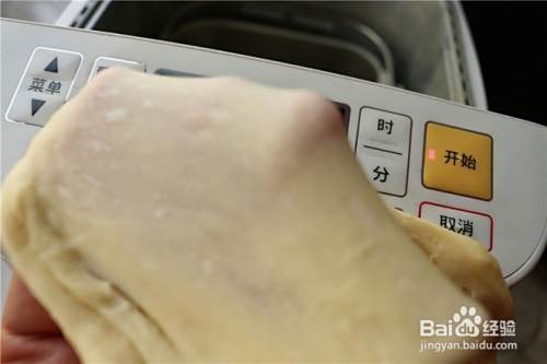 面团材料除了黄油之外的所有材料,用面包机揉15分钟左右加入室温软化的黄油,再揉15分钟,达到完全扩展阶段。