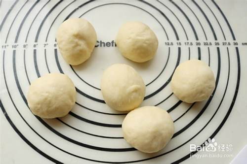 发酵好的面团移到揉面垫上,轻拍面团排出气体,分成6份。