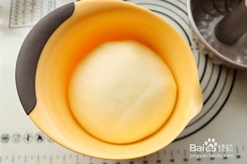 揉好的面团滚圆后,放入发酵盆里,盖保鲜膜发酵至2.5倍大。