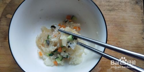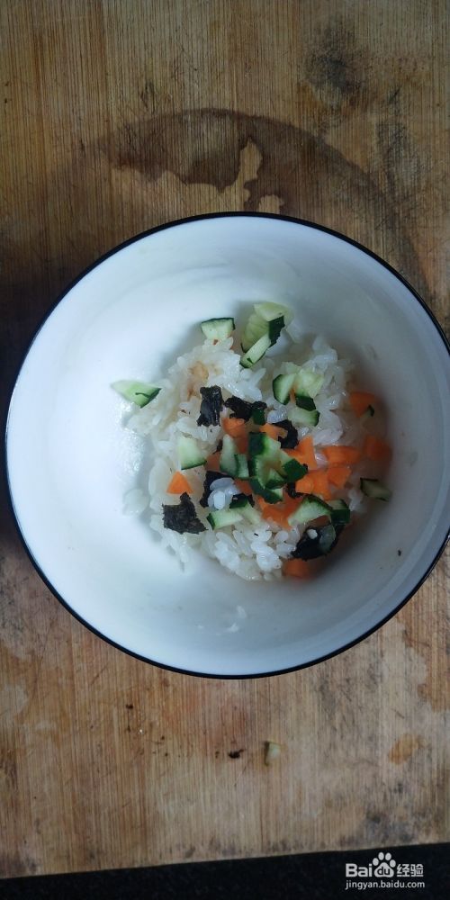 糯米提前浸泡一碗,放入少量水煮熟。将胡萝卜和黄瓜切成小碎块,和煮熟的糯米饭混合装入碗中,撒入适量盐。
