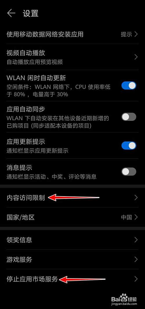 这里限制访问的有两个选项,一个是“内容访问限制”,另一个是“停止应用市场访问”,先看第一个;