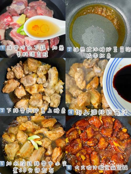 下入排骨翻炒均匀,倒入调味汁翻炒上色,倒入没过排骨的开水,加入葱姜