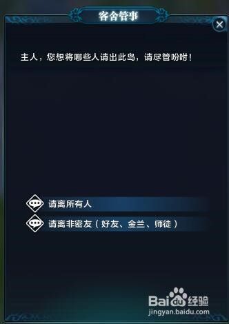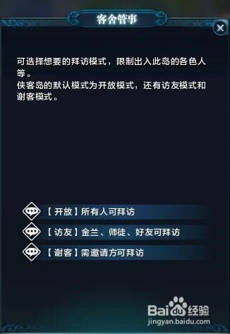 第三个NPC是客舍管事,主要就是侠客岛主人可以设置自己岛的访客模式和逐客模式,玩家可以根据自己的喜好和现场情况判定,具体如下。