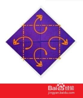2按照上面所说的方法把四角折叠好,效果如下图。再将四角折向中心。