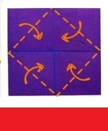 1正方形纸四角折向中心;再按箭头方向翻折到后面;折出中间的黄线正方形。