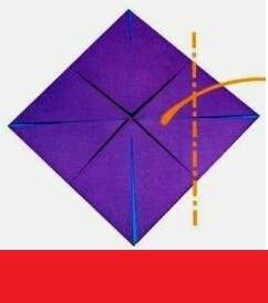 3翻面按上步所说折叠,沿着谷线位置折叠,然后用手拉开,剩下的三个角用同样的方式折叠拉开,如下图