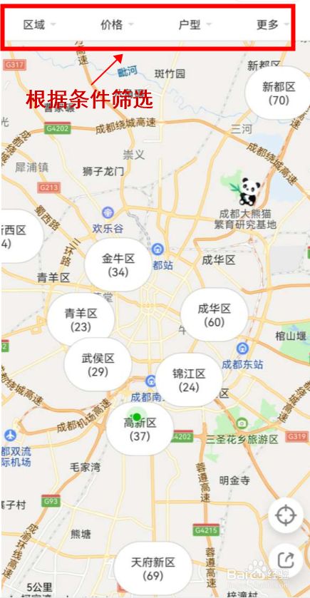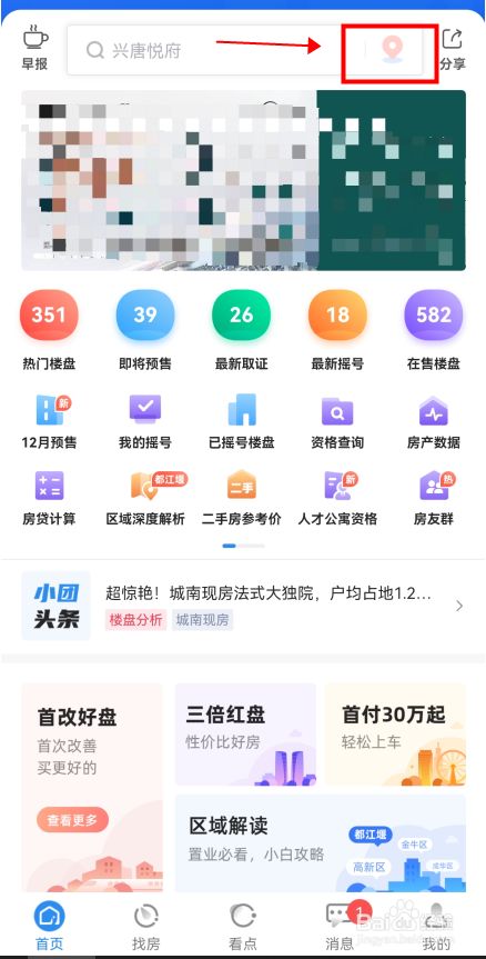在小程序首页顶部找到图标,点击进入地图找房。根据区域、价格、户型、更多条件筛选符合自己要求的新房