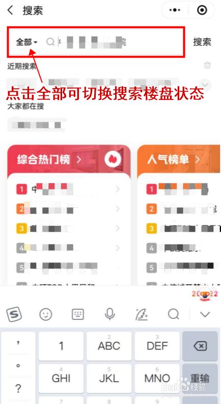 在小程序首页顶部点击搜索框,可根据新房名称(模糊名称均可)找房,搜索同时可筛选楼盘的销售状态等条件