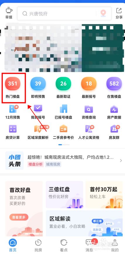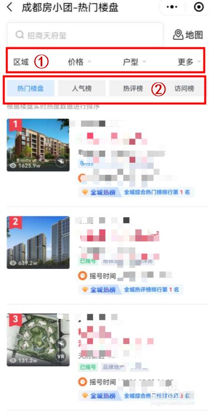 在小程序首页找到图标,点击进入 热门楼盘。①根据区域、价格、户型、更多条件筛选符合自己要求的新房 ②根据人气、评论、访问筛选热门楼盘