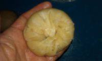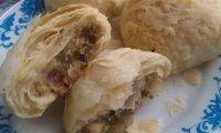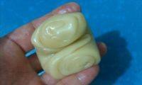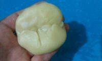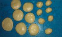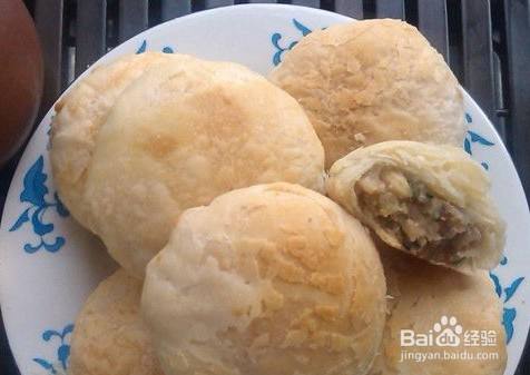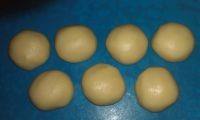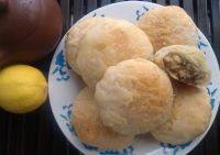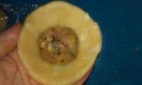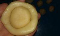 松驰好的面团用手按扁,按成边略薄于中间的圆型 包入馅芯1个