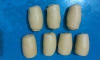 取1松驰好的面团,擀成椭圆形长条由下向上卷起 卷好后收口向下摆放,松驰10分钟