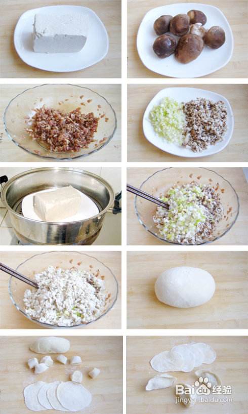 豆腐上锅蒸15钟,晾凉后,用小勺捣碎拌入肉馅内
