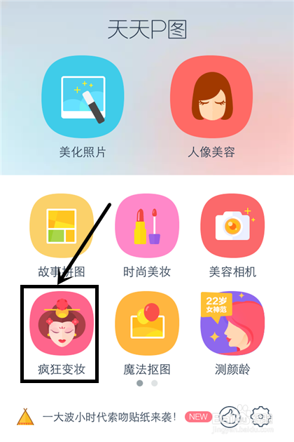 花千骨的妆容有着自己的特色,所以可以依靠APP来模拟。大家打开天天P图,在主页面点击“疯狂变装”选项。