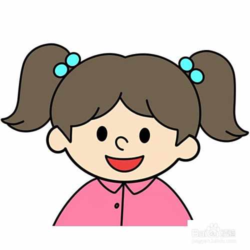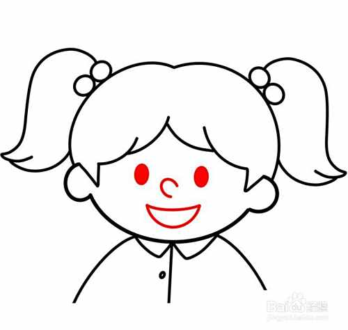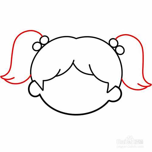 33、接下来,画出她的小辫子。在脑袋的两边分别画上一个马尾形状的头发,然后在辫子与头顶的连接处画一个带装饰的小皮筋,即两个小圆圈。