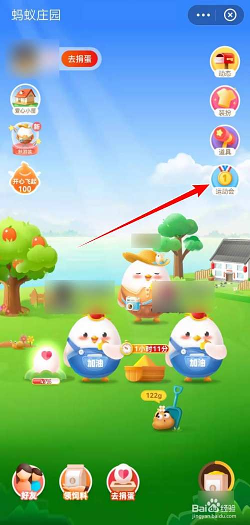 打开蚂蚁森林页面,可爱的小鸡们,选择右侧运动会;