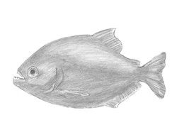 第11步:在身体的顶部,在尾巴的左侧画一个小三角形的形状,用于食人鱼的脂肪鳍。使用一系列线将身体下方的肛门鳍拖至尾部左侧。在绘制鱼的长方形翅片的外缘时,请沿着身体的路径走。