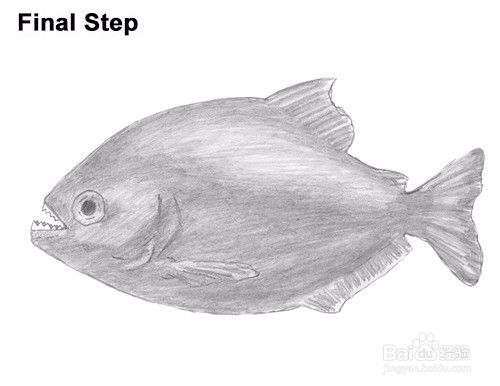 最后一步:为食人鱼图纸添加一些阴影,以增加尺寸和音量。尝试在整个身体上均匀地添加该值以获得光滑的皮肤,并避免粗糙粗糙的纹理。阴影可能会很费时,所以请耐心等待并休息一下。在身体的顶部做一个长的部分稍微轻一点,以指示闪耀。