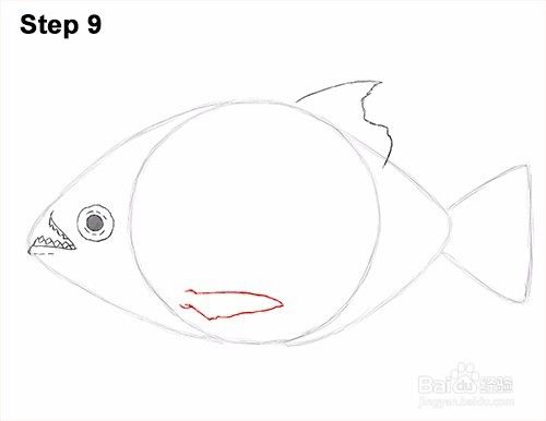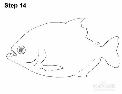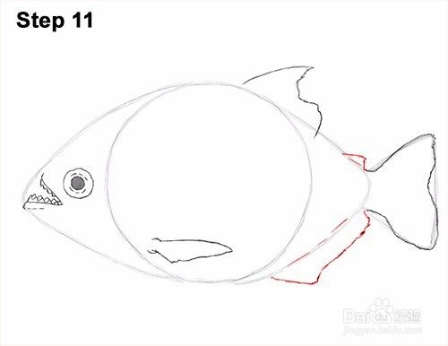 第12步:使用剩余的线条和形状作为指南来绘制食人鱼的其余部分。只需将初始引导线的外边缘变暗即可创建身体的形状。当你绘制身体的形状时,不要重叠鱼翅的线条。