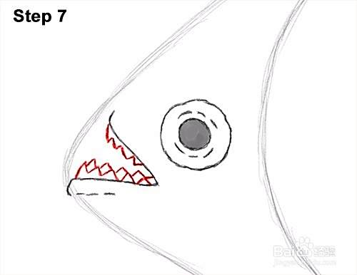 第7步:在嘴里面,在上下边缘,画出一系列三角形的牙齿。食人鱼的牙齿基本上由沿口边缘的锯齿形线组成。在嘴的另一侧的牙齿的第一组牙齿之间添加更多的三角形尖刺。以同样的方式添加第一排牙齿。沿着嘴的顶部绘制曲折线。
