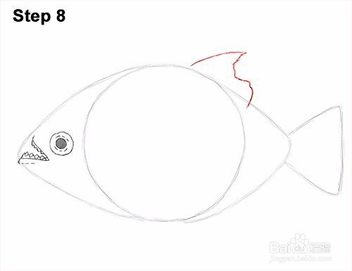 第8步:首先画一条弯曲的对角线,画出食人鱼的背鳍。然后绘制一条类似于右侧字母S的波浪线,以完成背鳍。