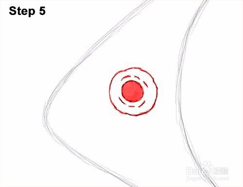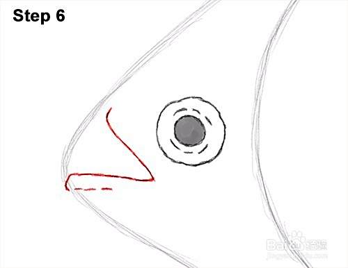 第5步:在头顶部附近,为食人鱼的眼睛画一个圆圈。使圆圈有点波浪,以指示眼睛的柔软边缘。在眼睛里面,为瞳孔画一个小圆圈。圈中的阴影。在鱼的瞳孔周围画几条线以获得额外的细节。