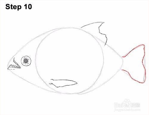 第10步:使用右侧的三角形形状作为引导来绘制食人鱼的尾巴或尾鳍。按照指南的基本路径,但在变暗线条时使形状更波浪。