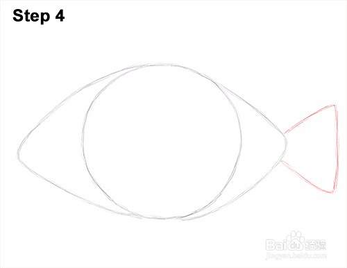 第4步:首先在身体右侧画一条垂直线,画出尾巴或尾鳍的导向。使用几条对角线将垂直线连接到身体,完成食人鱼尾鳍的指导。
