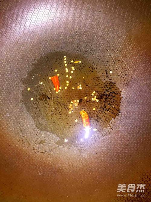锅中热油,放入花椒粒和干辣椒爆香