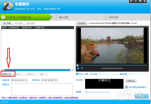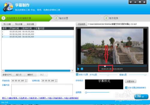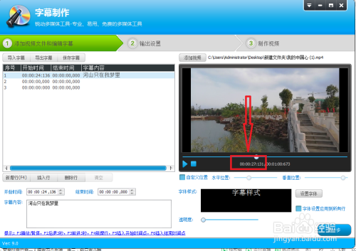 在软件左边的字幕内容上面,在字幕的时间轴上修改第一句歌词的结束时间:00:00:27:131,按下“F1“暂停