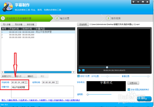 在软件左边的字幕内容里输入“河山只在我梦里“,再在字幕的时间轴上修改第一句歌词对应的时间“00:00:24:136”