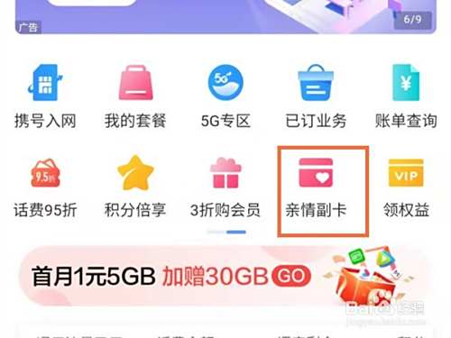 1、打开中国移动app,在首页点击亲情副卡。