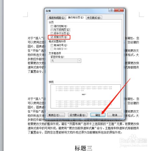 在换行与分页一栏里勾选段前分页,最后点击确定。