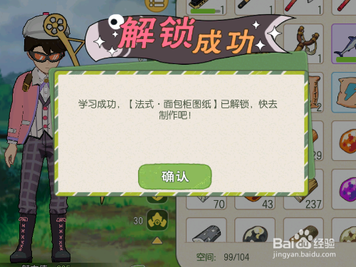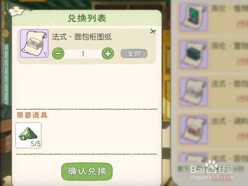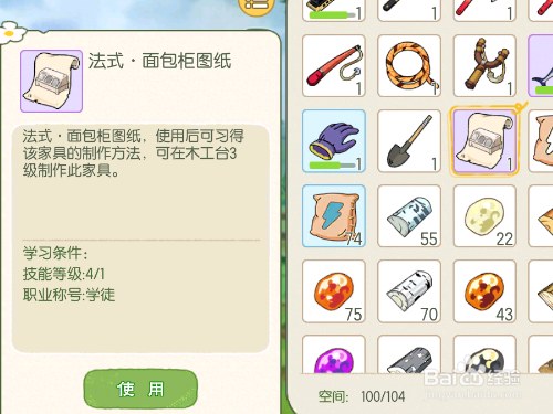 打开背包就可以看到兑换出来的法式面包柜图纸。我们选中并且点击使用,就可以学习制作法式面包柜。