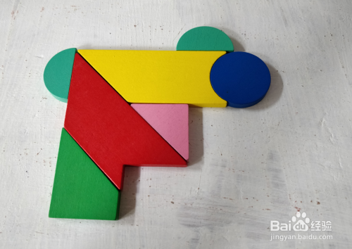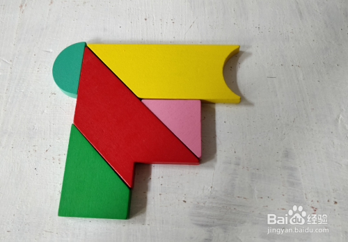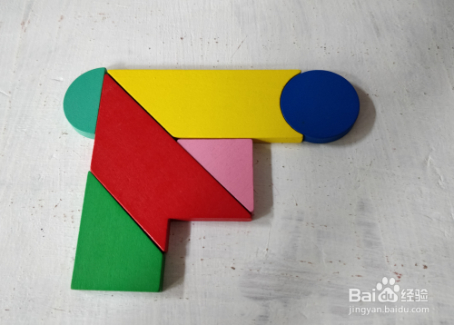 在黄色形状的上面右端,放上半圆形挨着,如图。一把(玩具)小手枪就拼组完成了。