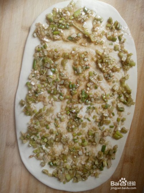 将腌制好的葱花涂抹到面片表面,从下到上卷起。