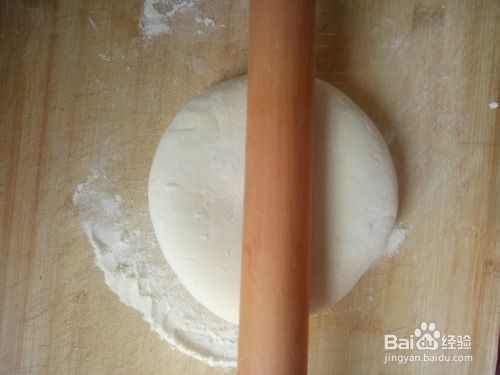 取出擀面杖,将面团压扁擀成有五厘米后的薄片。