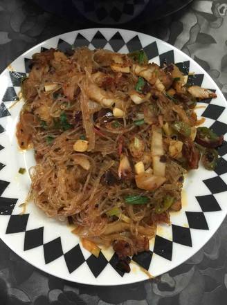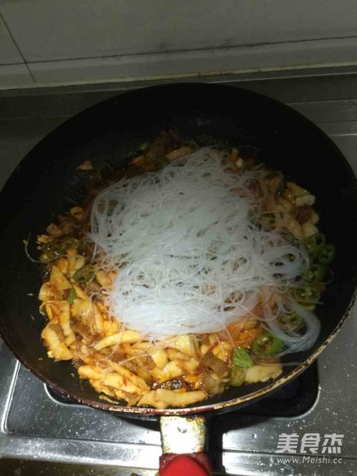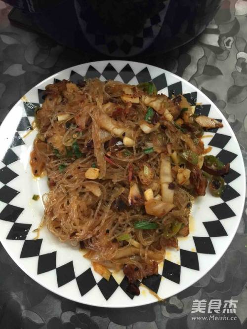 5转小火,加入虑水以后粉丝,加盐和生抽翻炒均匀,起锅前加把小葱,就可以起锅了!非常简单