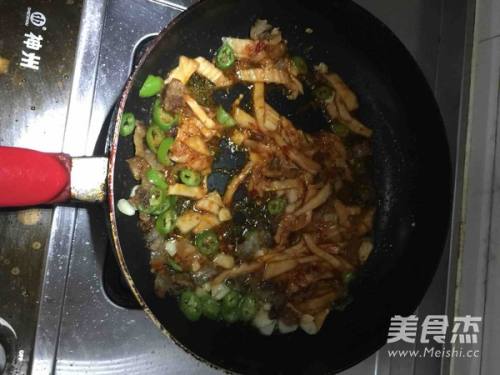 外面吃的都是泡菜苕粉肉丝,苕粉爱粘锅,不好把握,所以改用细粉丝,酸菜我喜欢用韩式泡菜,酸甜口,超级下饭!!!
