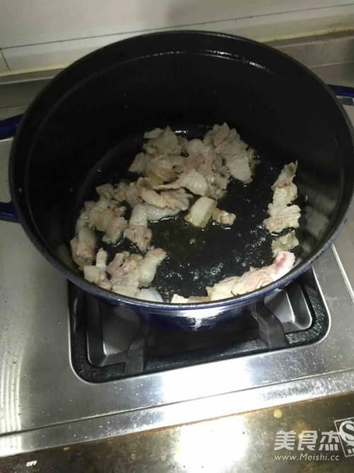 3锅烧热,加少量油,加五花肉翻炒至透明变色,出油后加大蒜