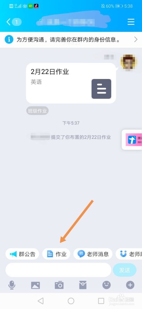 1、打开QQ家校群,点击“作业”。