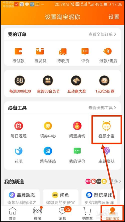 进入淘宝首页,切换到【我的淘宝】,在必备工具中找到【客服小蜜】;