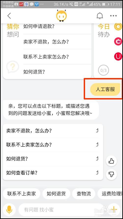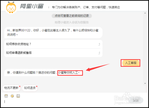 同样,进入机器人聊天窗口,发送“人工客服”小蜜会回复“小蜜帮你找人工~”