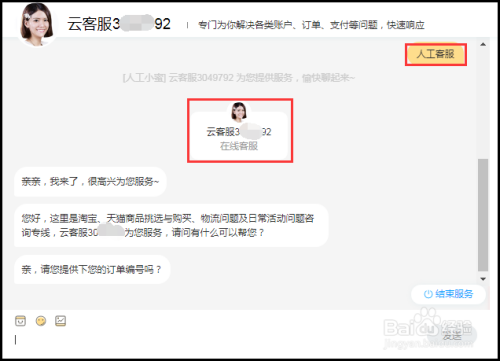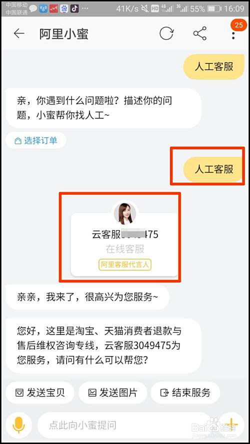 再一次发送“人工客服”,稍微等几秒钟人工客服就出来了。