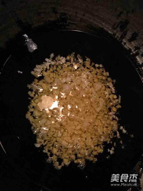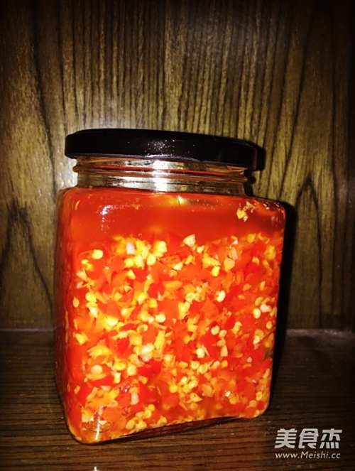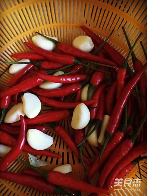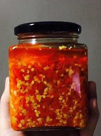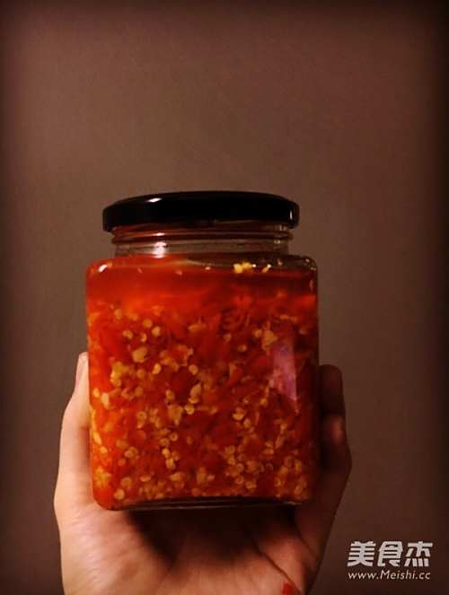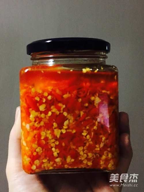 冷锅下油,小火,倒入蒜蓉,待至100度左右再加入辣椒
