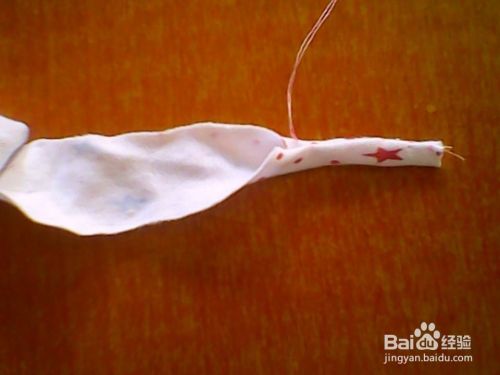把小布条的两边向中间先折一下,然后再对折,折成小带子的形状,如图边折边缝。